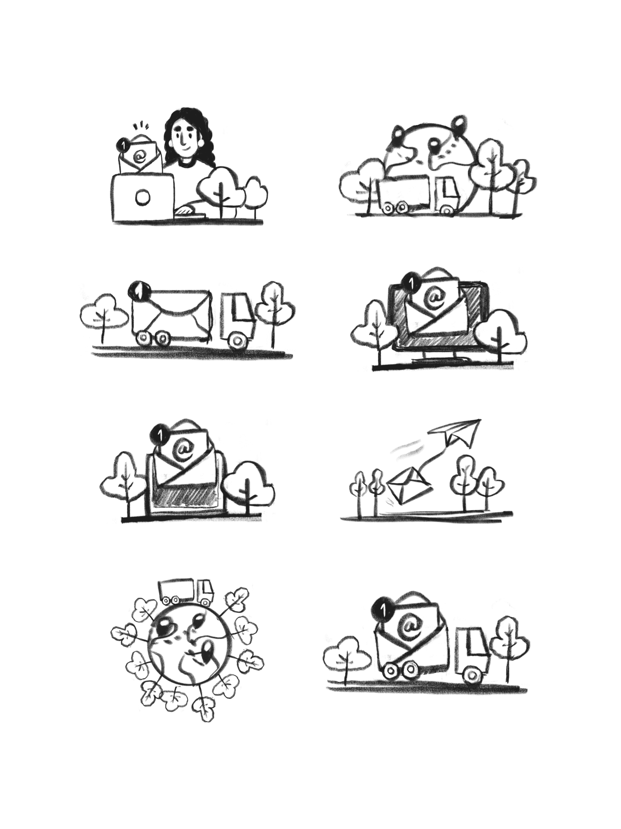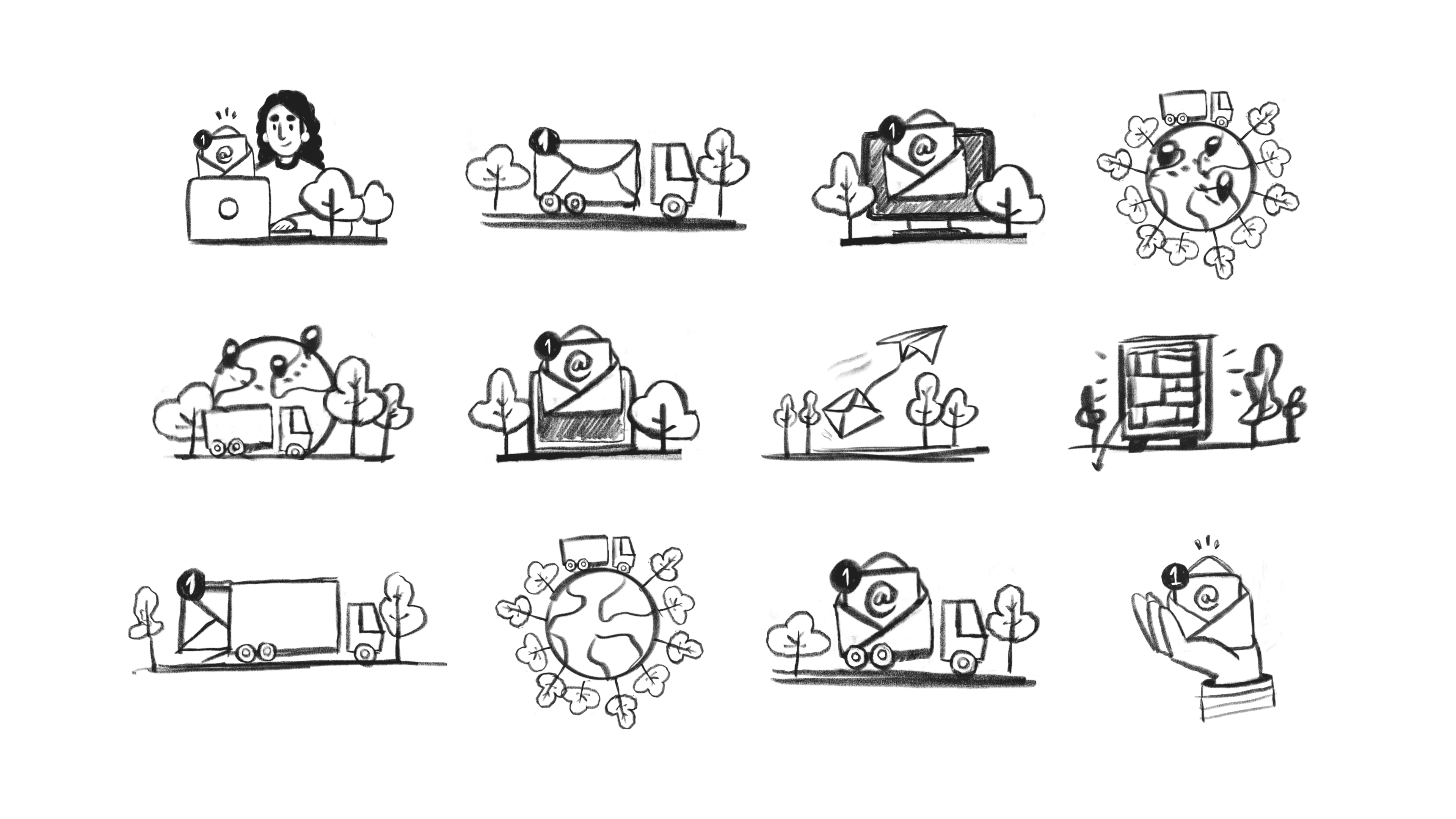 From there, I gathered references and sketched concepts combining visual symbols of the business: trees and the globe, already familiar in the brand’s icons, and the trucks as the central element. I designed the illustrations with shapes inspired by the icons themselves, ensuring seamless integration with the UI.