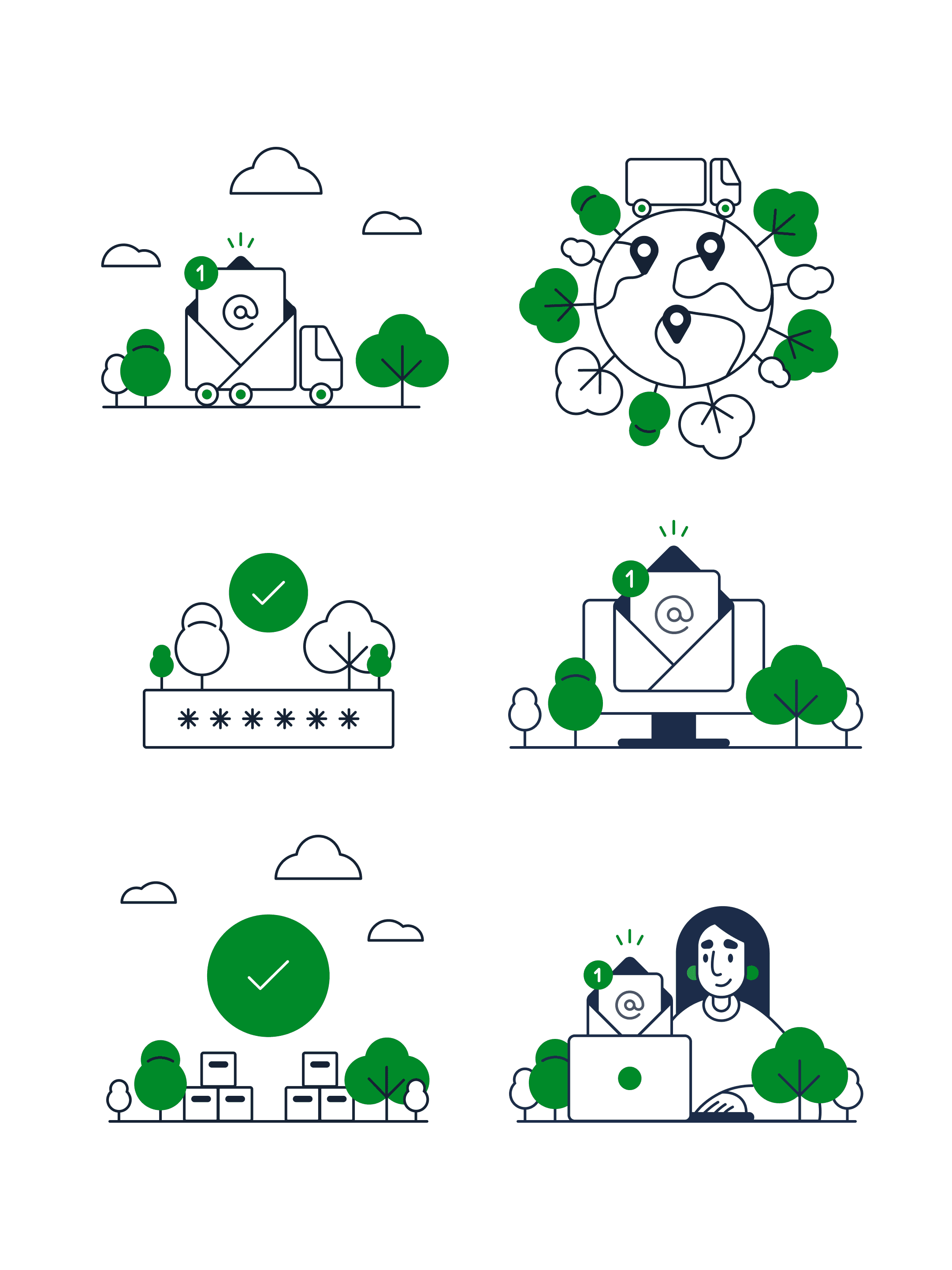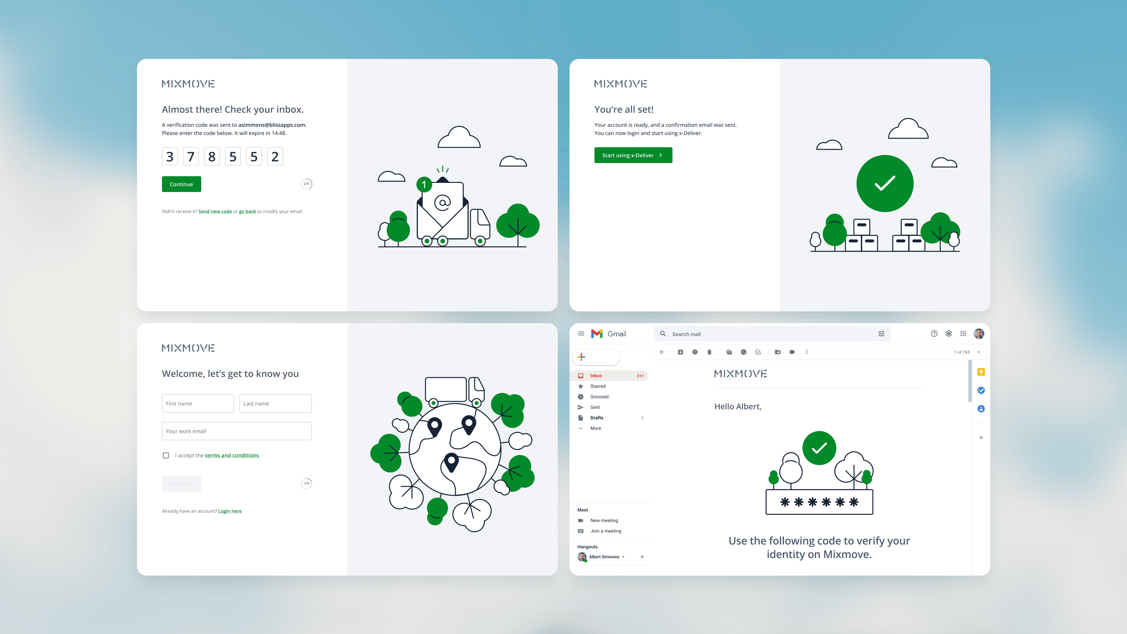 A custom illustration system for Mixmove’s onboarding flow, designed to reflect the brand’s focus on sustainability and logistics while integrating seamlessly with a clean, minimal UI.
