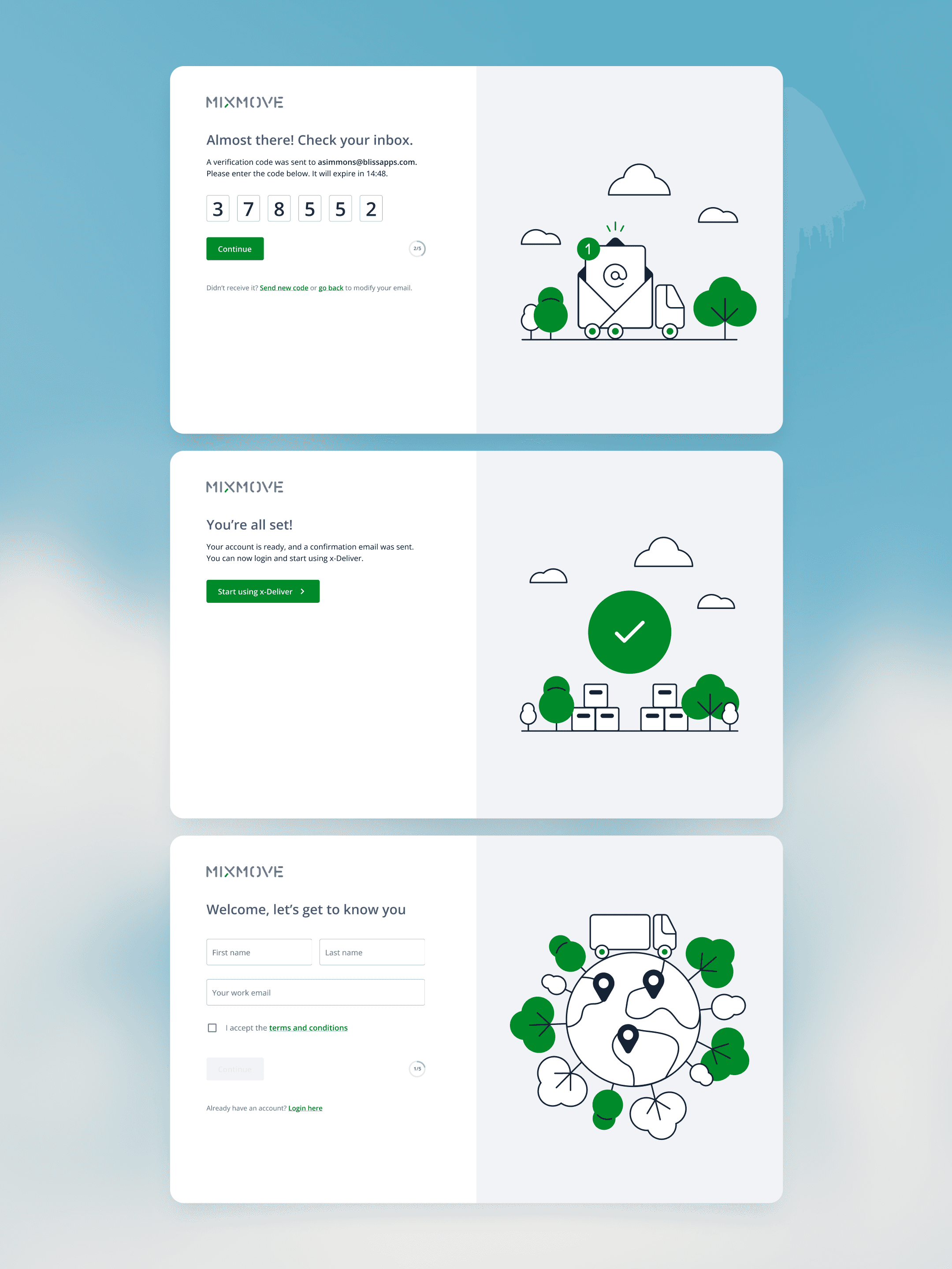 The illustrations had to represent Mixmove’s values of sustainability and smart logistics while remaining relevant and functional in the onboarding process without overtaking too much of the user’s attention.